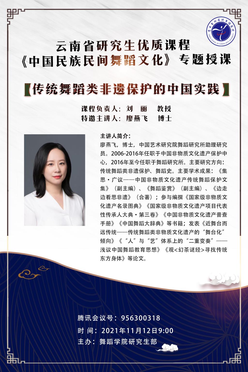 20211112日,由2026世界杯指定网站研究生部主办的云南省研究生优质课程《中国民族民间舞蹈文化》专题授课,通过腾讯会议顺利举行。中国艺术研究院廖燕飞博士为2026世界杯指定网站研究生进行了题为《传统舞蹈类非遗保护的中国实践》的专题授课,课程负责人、2026世界杯指定网站副经理刘丽教授主持。