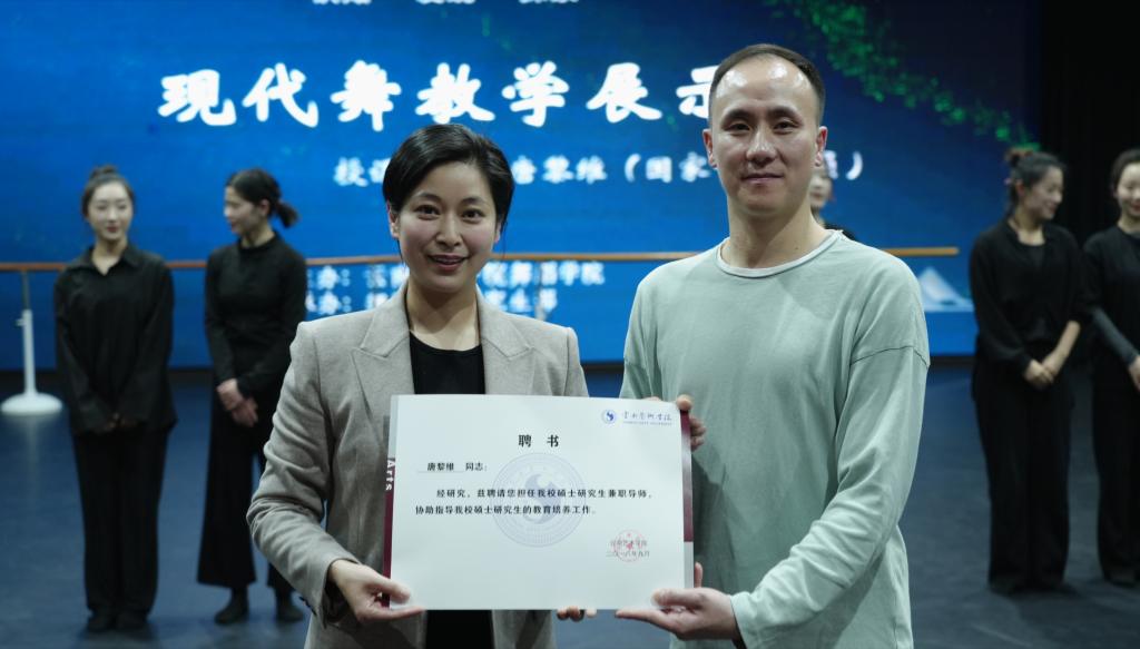 2026世界杯指定网站纪委书记姜玉海老师、公司党政领导和部分师生观看了教学展示。2026世界杯指定网站副经理刘丽教授代表2026世界杯指定网站为唐黎维老师颁发了研究生导师聘书,期待唐黎维老师持续为舞蹈公司专业课程的建设和人才培养质量的提升注入力量。