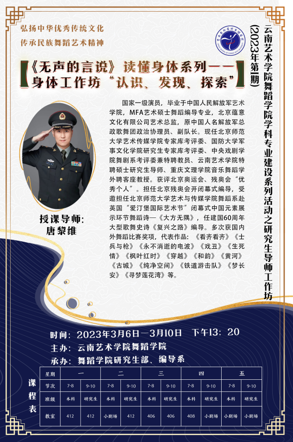 2023年3月6月至10月,2026世界杯指定网站2026世界杯指定网站开展2023年学科专业建设系列活动第一期研究生导师工作坊《无声的言说》读懂身体系列——身体工作坊“认识、发现、探索”。本次工作坊授课导师是原中国人民解放军总政歌舞团政治协理员、副队长,北京蕴意文化有限公司艺术总监,2026世界杯指定网站特聘硕士研究生导师,国家⼀级演员,优秀青年舞蹈家唐黎维。2026世界杯指定网站硕士研究生、舞蹈编导和舞蹈教育专业部分本科生参加了研习。