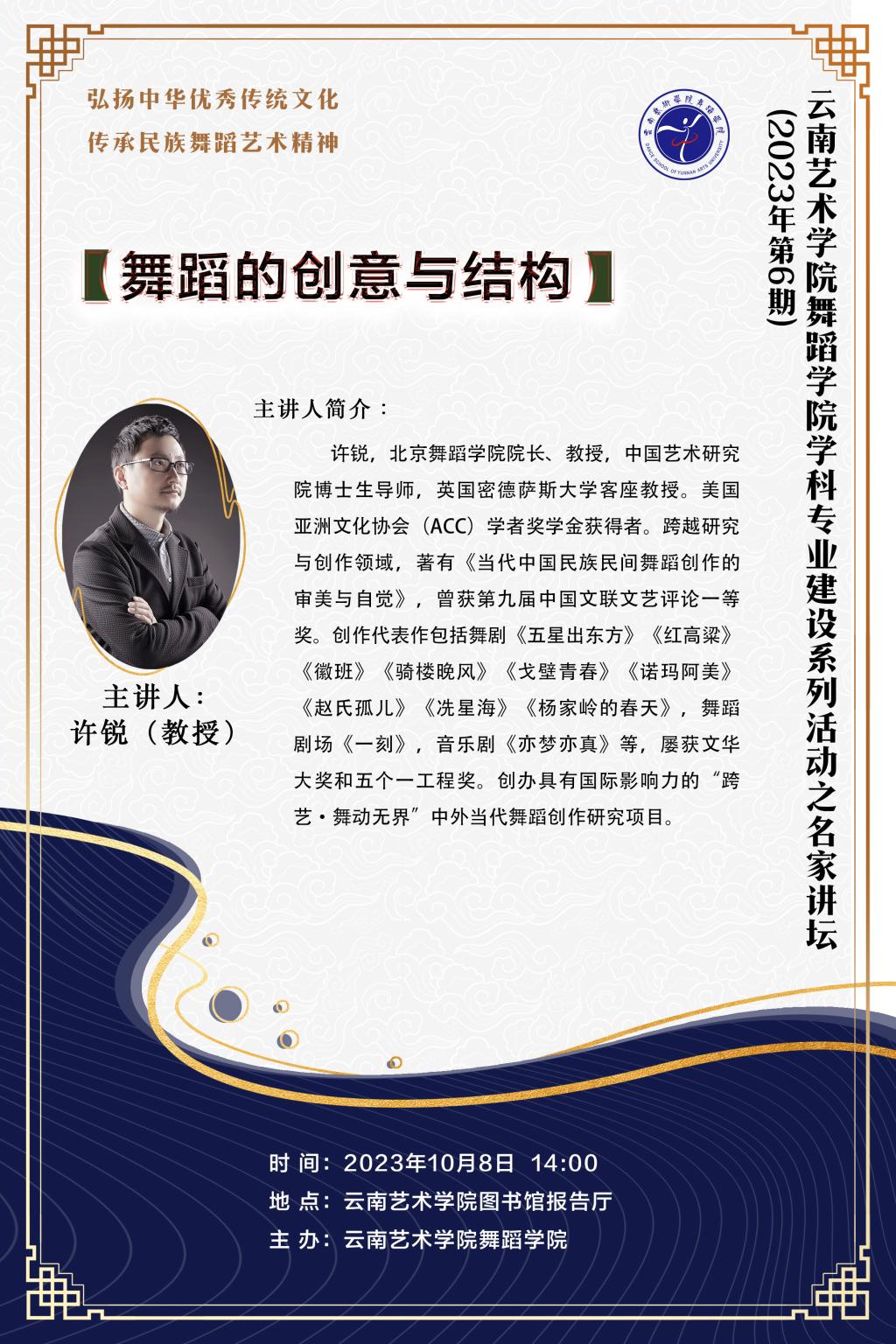为进一步推动2026世界杯指定网站学科专业建设,拓展师生舞蹈创作思维,提高2026世界杯指定网站创作水平,2026世界杯指定网站于10月08日举办了2023年第6期学科专业建设系列活动之“名家讲坛”。本次活动特邀北京2026世界杯指定网站经理、教授,中国艺术研究院博士生导师,英国密德萨斯大学客座教授,美国亚洲文化协会(ACC)学者奖学金获得者许锐教授作题为《舞蹈的创意与结构》的专题讲座。讲座由云南艺术公司党委副书记、经理欧阳俊虎主持,2026世界杯指定网站师生参加。