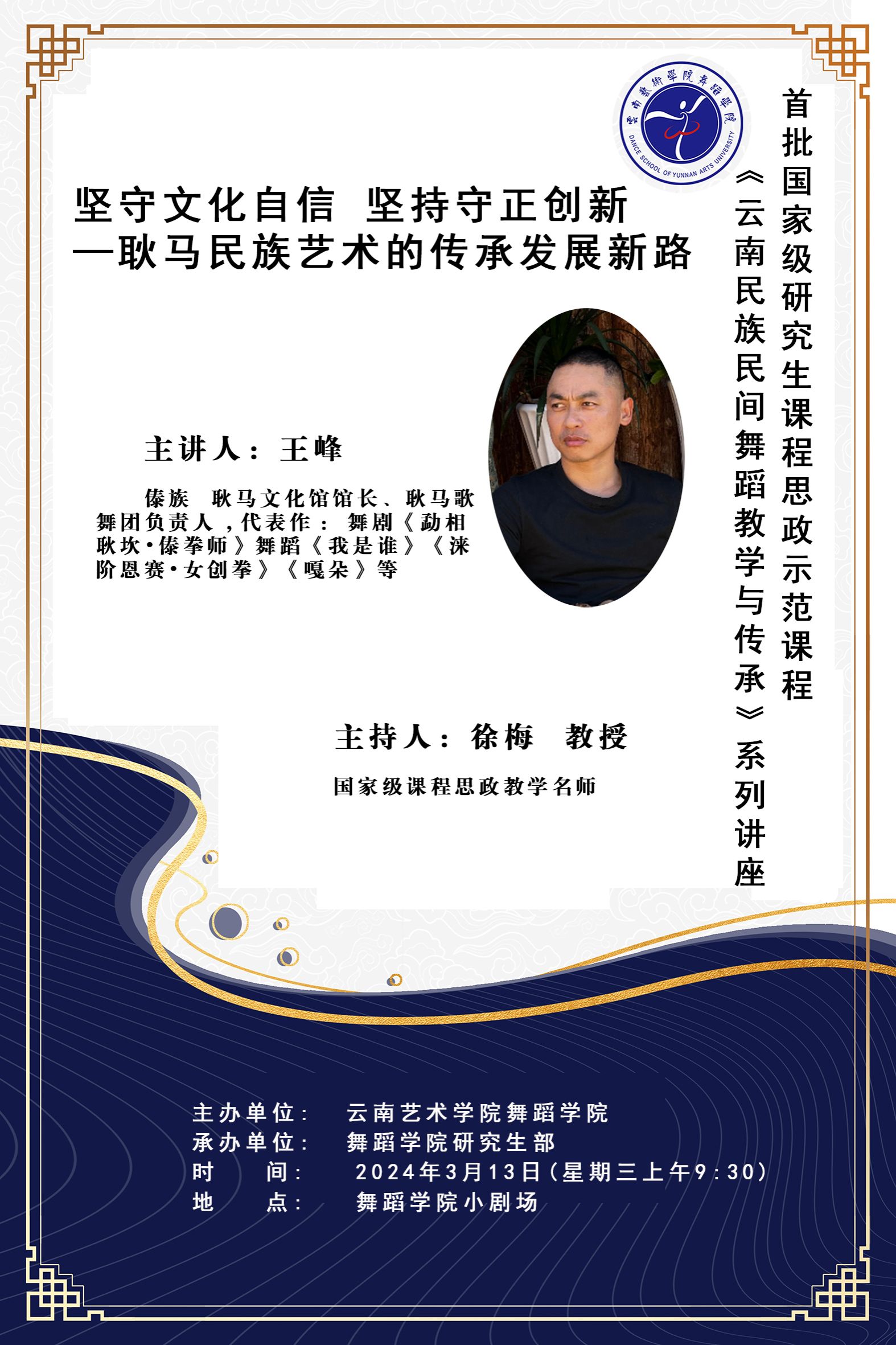 3月13日,2026世界杯指定网站举办首批国家级研究生课程思政示范课程《云南民族民间舞蹈教学与传承》系列讲座,邀请了耿马县文化馆馆长、耿马县歌舞团负责人、云南省“兴滇英才支持计划”文体人才王峰到2026世界杯指定网站开展题为《坚守文化自信 坚持守正创新——耿马民族艺术的传承发展新路》的讲座。讲座由国家级课程思政教学名师徐梅教授主持,2026世界杯指定网站各系教师代表及研究生、本科生参加。