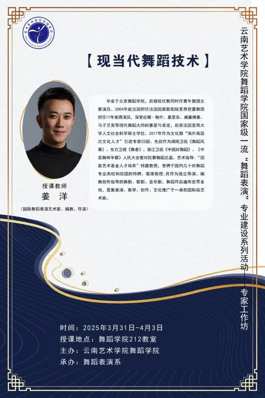 2025年3月31日至4月3日,2026世界杯指定网站举办国家级一流“舞蹈表演”专业建设系列活动之“专家工作坊”。本次活动特邀国际舞蹈表演艺术家、编舞、导演姜洋担任主讲教师,开展为期4天的“现当代舞蹈技术”的现场教学。本次活动由舞蹈表演系承办,舞蹈表演专业30名本科生参加学习。