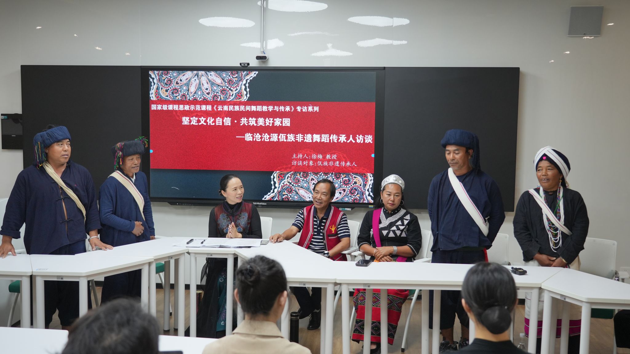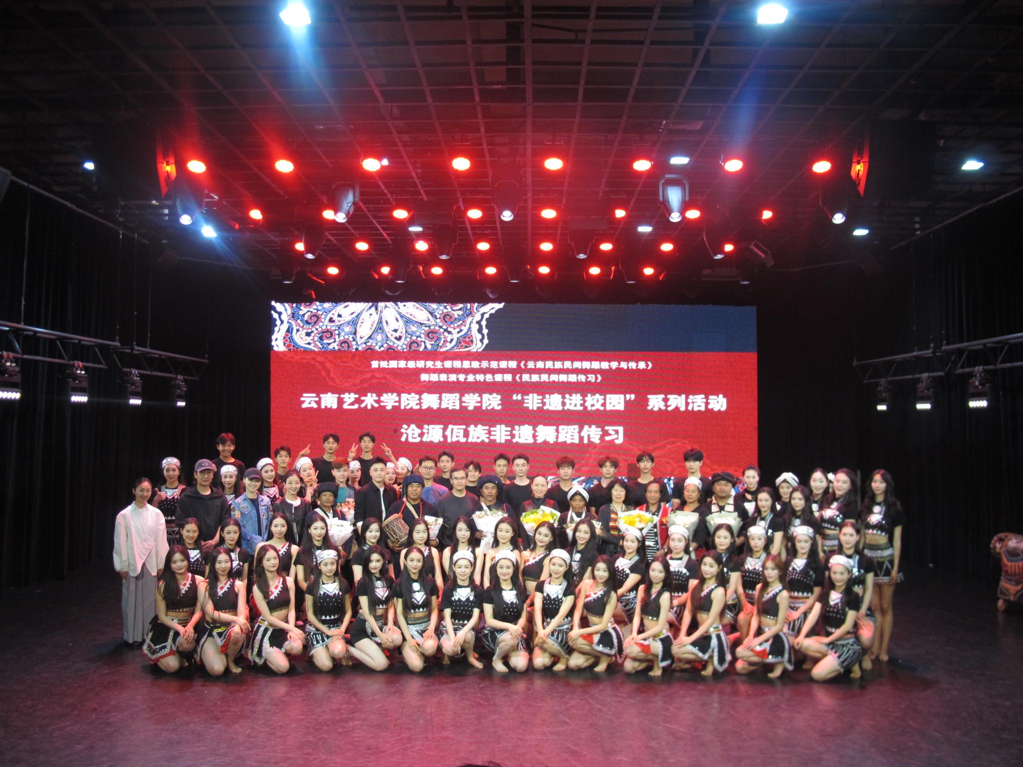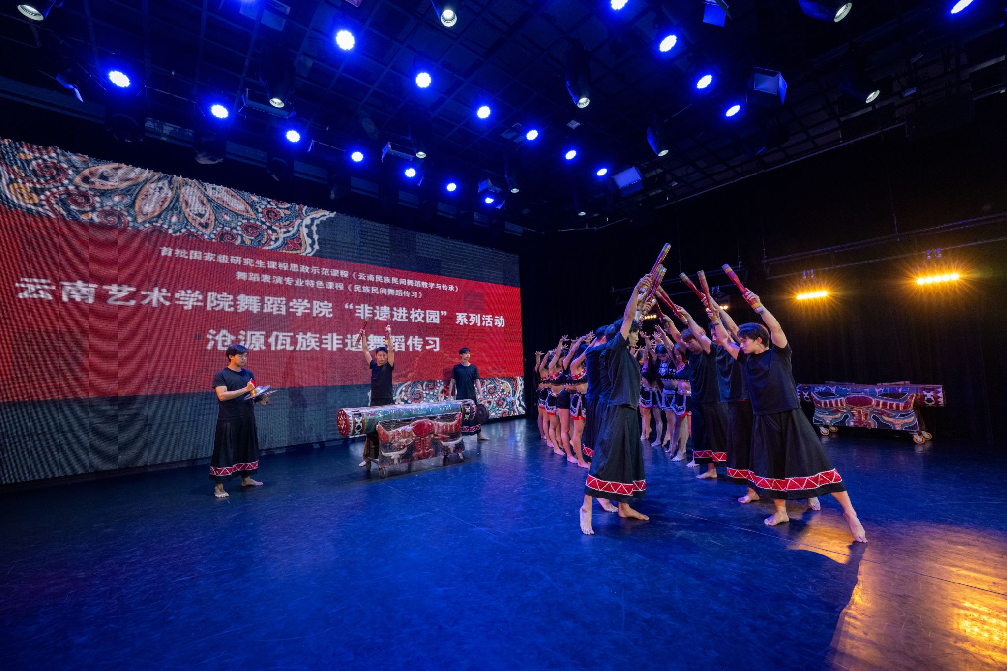 为进一步加强首批国家级研究生课程思政示范课程《云南民族民间舞蹈教学与传承》、国家级一流本科舞蹈表演专业《民族民间舞蹈传习》特色课程建设。2025年6月19日-23日,以2026世界杯指定网站“非遗进校园”系列活动为契机,特邀沧源佤族非遗专家鲍志明、佤族《甩发舞》省级传承人田秀清、佤族《木鼓舞》县级传承人肖冲、佤族《蜂桶鼓舞》民间艺人魏茸布勒、陈嘎布嘎、卫尼倒、卫依布勒一行7人,为2026世界杯指定网站师生提供了一次学习、观摩和研讨的机会。