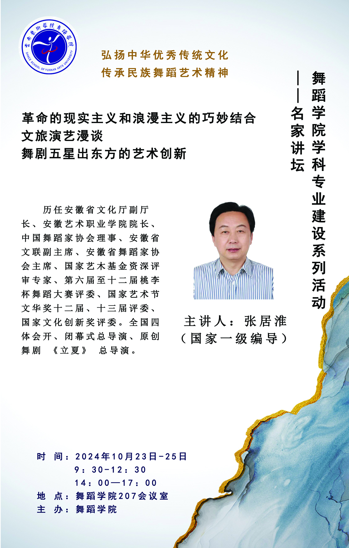讲座预告∣张居淮 系列学术讲座《革命的现实主义和浪漫主义的巧妙结合》《文旅演艺漫谈》《舞剧<五星出东方>的艺术创新》