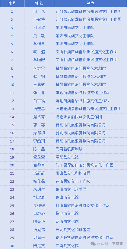 云南艺术基金2024年度艺术人才培训资助项目“云南基层文艺院团舞蹈编创人才培训”,本着择优录取的原则,经项目组遴选,并报云南艺术基金管理领导小组办公室审核,录取符合条件学员30名。