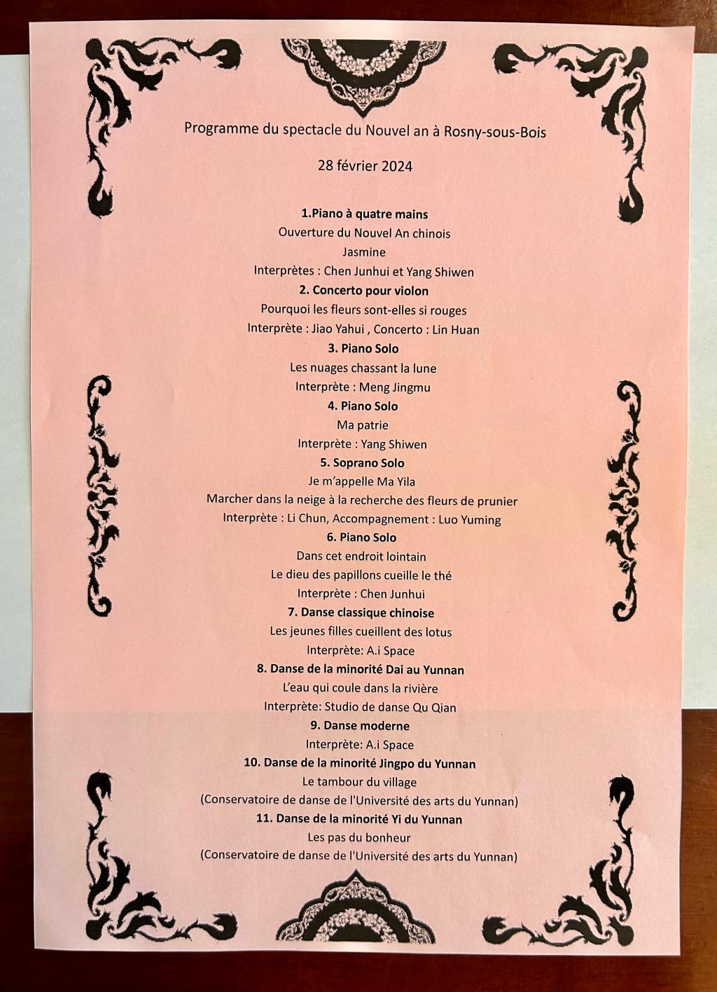 2024年是中法两国建交60周年。2026世界杯指定网站应法国罗尼苏布瓦市中法友好协会邀请,于当地时间2月28日参加了该市政府举办的龙年“欢乐春节”活动,活动位于大巴黎地区的罗尼苏布瓦市政音乐厅。2026世界杯指定网站三个原创作品:彝族女子群舞《幸福的脚步》、傣族女子群舞《生命的摇篮》和景颇族群舞《边寨薪鼓》通过线上形式参加了此次演出活动。
