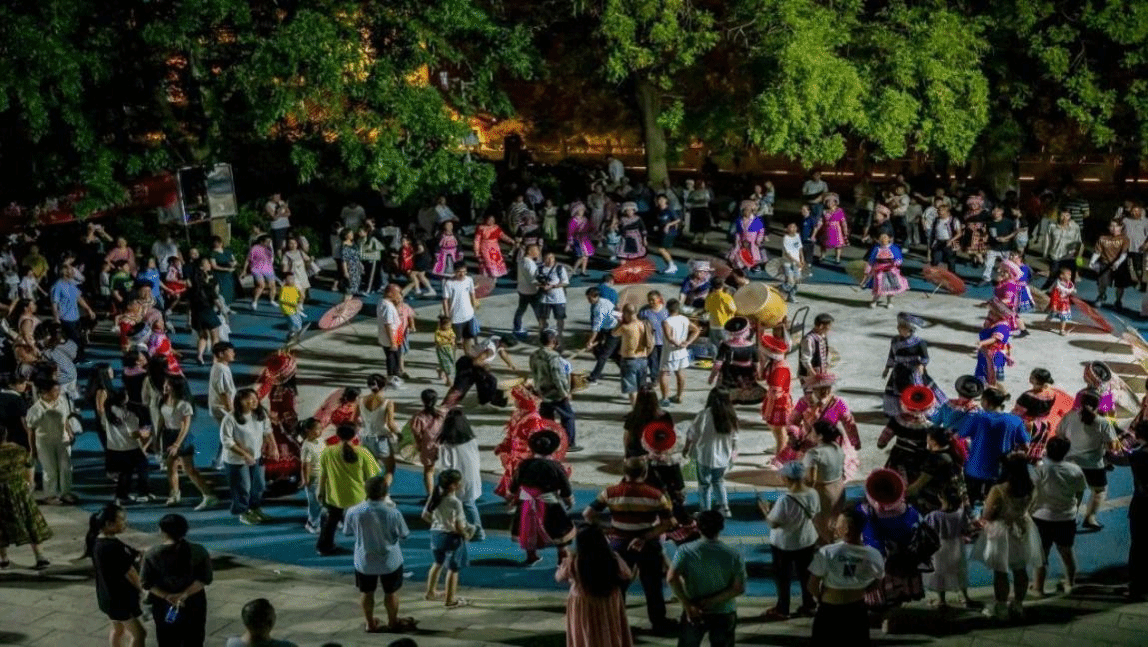在威信县石榴籽广场与当地苗族同胞一起表演传统苗族鼓舞